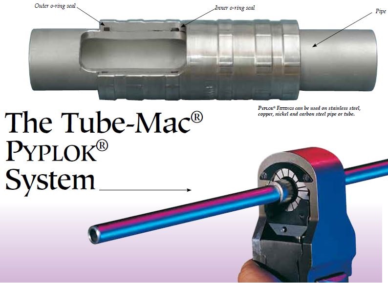 The Tube-Mac Pyplok connection system is mechanically attached and has a successful history of pipe and tube fabrication in the most demanding environments. Using a portable, hand held tool, fittings are cold worked and permanently compressed onto the piping, The Pyplok® couplings are available in sizes from ¼” to 4” nominal pipe sizes for pressures up to 9,300 psi. Metric and OD tube sizes are also available.